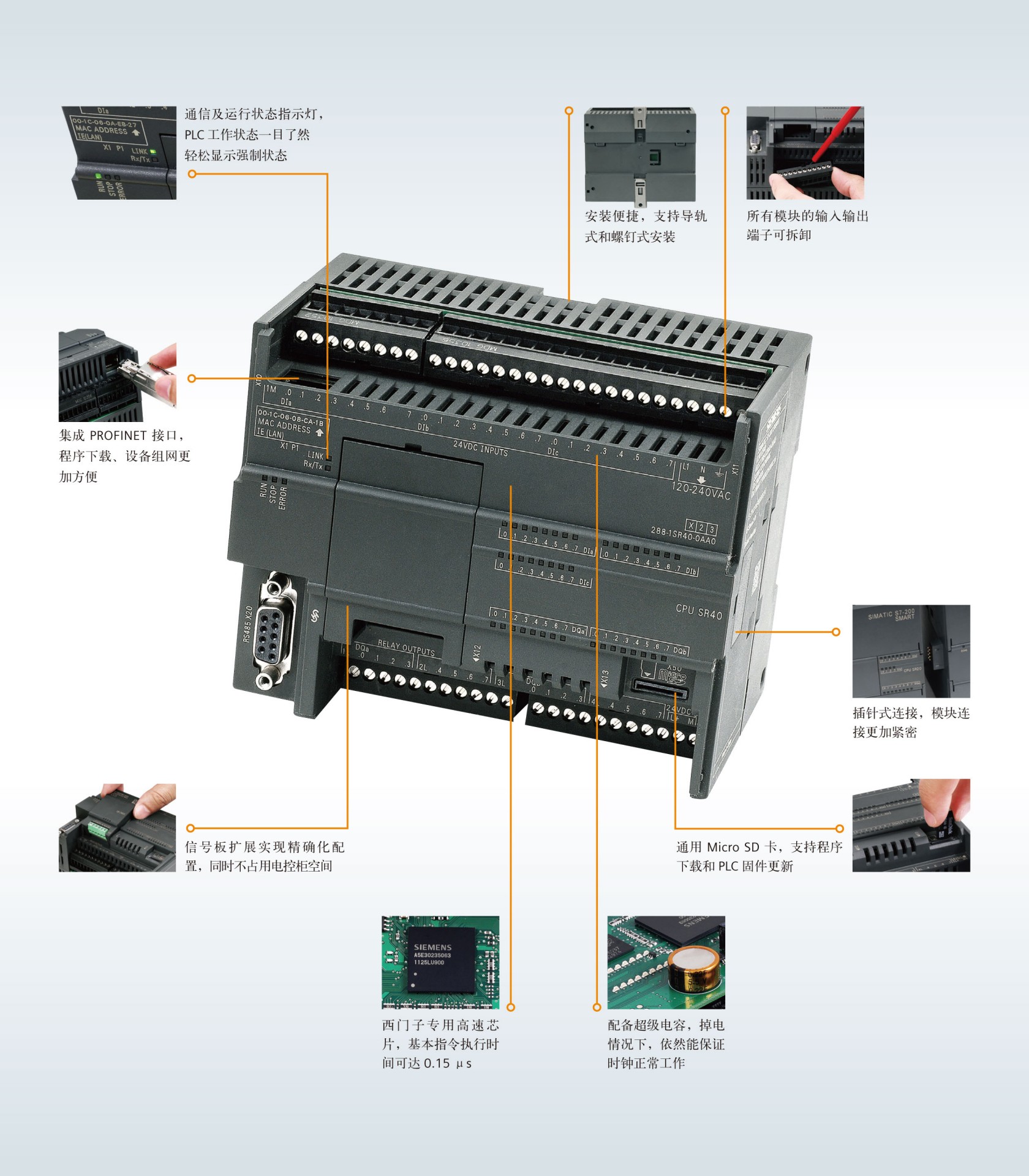 配備西門子專用高速處理器芯片,基本指令執(zhí)行時間可達 0.15 μs。